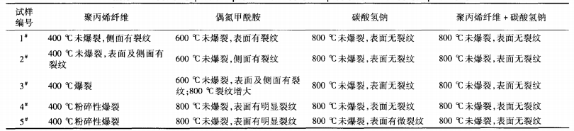 (3)添加防爆劑試樣的抗爆裂性能得到明顯改善,尤其采用碳酸氫鈉或碳酸氫鈉+聚丙烯有機纖維復合的防爆劑抗爆裂效果最好。
