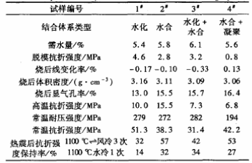 比較發(fā)現(xiàn),在這4種不同結(jié)合體系的試樣中,采用水化結(jié)合體系的1#試樣的需水量相對較低,燒后顯氣孔率低,脫模強度和燒后常溫及高溫強度較高;而采用水合結(jié)合體系的2#試樣的高溫強度和抗熱震性明顯優(yōu)于其他試樣,但其脫模強度較低。綜合考慮,選擇水化結(jié)合作為本研究的結(jié)合體系。