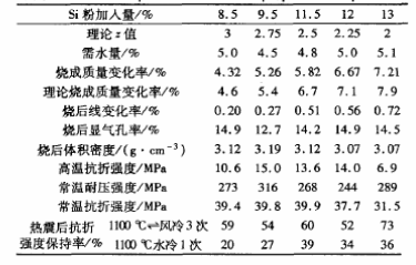 氮化燒成后試樣按相應標準測試各種物理性能,其中高溫抗折強度測試條件為1400℃保溫0.5h。