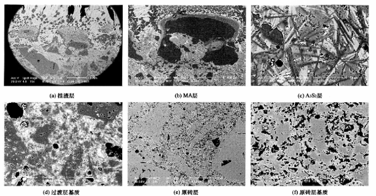 (a) MA層。如圖1(b)所示,厚度約0.8mm。該層中的剛玉顆粒被嚴重侵蝕,并在顆粒邊緣生成了一層MA;顆粒內(nèi)部的Al203則反應生成大量的MA顆粒,這些顆粒分布于C2AS、CAS2等鈣鋁硅酸鹽低熔點相間;|(zhì)已與渣中成分完全反應,生成了大量的鈣鋁硅酸鹽低熔點相。