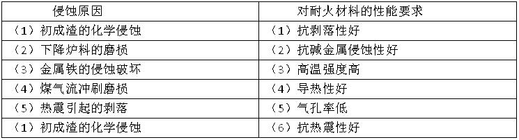 高爐爐身下部和爐腰的溫度高達(dá)1400~1600℃,是高爐出渣和金屬鐵形成的主要區(qū)域。從爐襯下部到爐腰的磚襯,既受下降爐料和上升高溫高壓煤氣的磨損以及溫度變化引起的熱沖擊,又受到FeO高堿度初渣的化學(xué)侵蝕,更為嚴(yán)重的是堿金屬和鋅蒸汽造成的炭素沉積和化學(xué)反應(yīng),使耐火磚組織脆化,失去強(qiáng)度。爐身下部、爐腰侵蝕原因及對(duì)耐火材料的基本性能見(jiàn)下表。