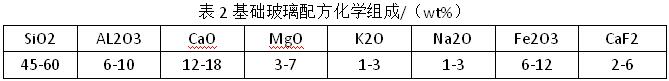 實(shí)驗(yàn)以白云鄂博尾礦和粉煤灰為主要原料,參照四元相圖設(shè)計(jì)輝石相為主晶相的微晶玻璃基礎(chǔ)配方。原料成分如表l,基礎(chǔ)玻璃成分如表2。