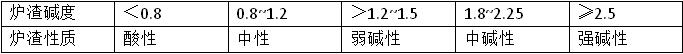 表示爐渣酸堿性的參數(shù)是爐渣的堿度,用渣中主要的堿性氧化物與酸性氧化物的比例衡量之。AL2O3為兩性氧化物,在酸性渣中AL2O3呈現(xiàn)堿性,在堿性渣中呈現(xiàn)酸性,所以在酸性渣主要性質(zhì)中不計(jì)入AL2O3的量,而在堿性渣計(jì)算中,將AL2O3作為酸性氧化物計(jì)入。粗略劃分時(shí),常將R=1作為中性渣:R>1為堿性渣:R<1為酸性渣,表2列出了不同性質(zhì)錄制的堿度。