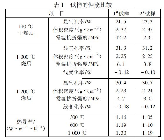 加水?dāng)嚢钑r(shí)發(fā)現(xiàn),1# 澆注料的需水量( w) 為 12%,比2#澆注料的13%稍低。經(jīng)攪拌、成型后,兩種澆注料分別在110 ℃ 24 h、1000 ℃ 3 h 和1200 ℃3 h 熱處理,然后檢測(cè)其性能,結(jié)果見(jiàn)表 1。可以看出: 與 2# 試樣相比,1# 試樣 110 ℃ 干燥后的顯氣孔率較低,體積密度和常溫抗折強(qiáng)度較大; 1 000、1 200 ℃燒后,兩種試樣的顯氣孔率和體積密度相似,而1# 試樣的常溫抗折強(qiáng)度,燒后線收縮率和熱導(dǎo)率( 300、600 以及 1 000 ℃ ) 均比2#試樣的高。