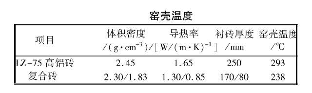 回轉窯多采用高鋁質(zhì)或堿性磚單層砌筑,由于其導熱系數(shù)較大,致使窯殼溫度較高(300℃左右),熱量損失大,能耗高。而采用保溫板、纖維棉或輕質(zhì)隔熱磚等雙層或多層砌筑形式雖能降低窯殼溫度,但由于窯體的轉動會引起磚體和隔熱層之間的錯位和松動,整體性不好,容易出現(xiàn)掉磚甚至垮塌。采用復合磚,就能有效解決這一問題,重質(zhì)層和半輕質(zhì)層復合一體,既降低了窯殼溫度,還能保證窯體轉動過程中的整體性,同時還可減輕內(nèi)襯重量,利于回轉窯運行。