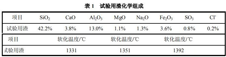 垃圾熔融爐所處理固體污染物的化學(xué)組成對(duì)使用的耐火材料抗渣性能要求非常高,在進(jìn)行選材試驗(yàn)前,先對(duì)試驗(yàn)熔渣的化學(xué)成分和熔化溫度進(jìn)行測(cè)試,試驗(yàn)用渣采用某垃圾熔融爐所處理的原始固體廢物,其化學(xué)組成如表 1 所示,試驗(yàn)用磚采用高純剛玉磚和鉻剛玉磚作為此次的實(shí)驗(yàn)?zāi)突鸩牧稀?/FONT>