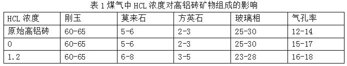 2:通過(guò)對(duì)不同HC1濃度煤氣侵蝕后高鋁磚的分析和檢測(cè)可以得出以下結(jié)論煤氣中的HCI氣體會(huì)促進(jìn)部分硅酸鹽玻璃質(zhì)和隱晶質(zhì)鋁硅酸鹽轉(zhuǎn)變成莫來(lái)石 (3AL2O3·2SiO )和方英石 (Si0 ),高鋁磚表層剛玉和莫來(lái)石的顆粒結(jié)晶度明顯變差,氣孔率增大.