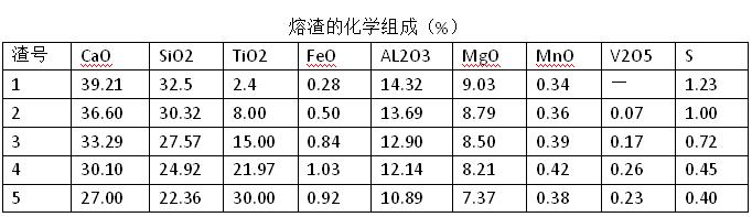 實(shí)驗(yàn)用熔渣以攀枝花鋼鐵公司和重慶鋼鐵公司高爐現(xiàn)場渣加少量化學(xué)試劑配制,并熔煉成3~5mm的渣粒待用。渣的化學(xué)組成見表1.