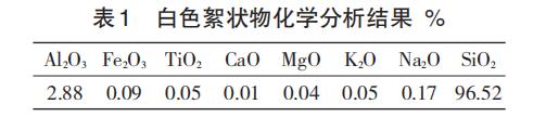 從試驗的總體情況來看,試樣燒制完成后,在排氣孔附近出現了很多白色的絮狀物質,該物質應該是從樣品內部揮發(fā)出來的反應生成物。對白色絮狀物進行化學分析,結果見表1,從表1中數據得知,白色絮狀主要是SiO2。