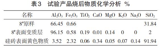 采用硅磚時發(fā)現表面凝結了很厚的一層黃色物質,且硅磚侵蝕嚴重,存在很明顯的脫落物,硅磚抗侵蝕前厚度為65.70 mm,侵蝕后厚度為61.88 mm,整體侵蝕率為5.8%。8#磚出現了很明顯的變質層,變質層厚度為2.5 mm。 對8#變質層的物質清理下來一部分用于分析,分析結果顯示如表3 所示。從檢測結果可以看出白色變質層中的AI2O3含量增加29.7%,SiO2含量減少29.84%