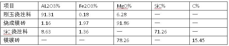 所用工業(yè)鈦渣的化學(xué)組成為:TiO 78%,F(xiàn)eO 5.98%,CaO 1.05%,SiO25.96%,A12O3 3.27%,MgO5.03%。剛玉澆注料、燒成鎂磚、SiC澆注料和鎂碳磚4種耐火材料的主要化學(xué)組成見表 1。