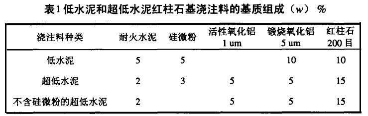 表2示出了不同低水泥骨料澆注料的配比:(1)以全紅柱石為骨料的低水泥澆注料,可用于 對(duì)熱穩(wěn)定性,抗熱震性和低蠕變性要求很高的設(shè)備中。如中間包,鋼水包和鐵水包的永久襯等。(2)紅柱石骨料的50%換成焦寶石。焦寶石是莫來(lái)石和方石英的混合物,它的各項(xiàng)性能均低于紅柱石。與全紅柱石澆注料相比,這種澆注料的性能稍有下降,但成本減少很多。(3)把全紅柱石澆注料骨料中的中大顆粒換成鋁礬土。鋁礬土的基本組成是燒結(jié)剛玉有很強(qiáng)的抗機(jī)械磨損性能。這種澆注料除紅柱石帶來(lái)的熱穩(wěn)定性,抗熱震性和低蠕變性外,鋁礬土的加入帶來(lái)了抗機(jī)械磨損性能?捎糜阡撍,鐵水包和高爐的鐵水溝工作襯。