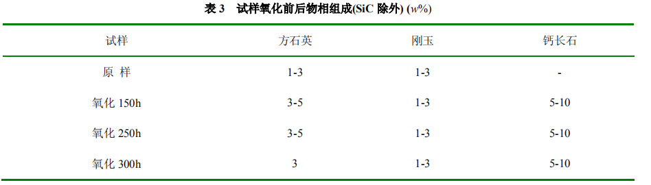 表3給出了不同氧化時間試樣的物相組成分析結(jié)果,圖3(a)、圖3(b)、圖3(c)分別是原始試樣、氧化150h和氧化300h試樣的XRD圖譜。原樣中,未發(fā)現(xiàn)CaO·Al2O3 (CA)和CaO·2Al2O3(CA2),氧化后150h后,出現(xiàn)新物相鈣長石(CaO·Al2O3·2SiO2,CAS2),方石英有較明顯的增加,而后增加氧化時間,物相組成變化不明顯。