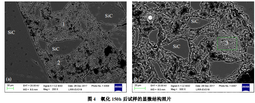 圖4(a)、圖 4(b)表示了試樣氧化150h后的顯微結(jié)構(gòu),可見部分SiC顆粒和細粉邊緣不平滑,顯示氧化跡象SEM發(fā)現(xiàn)許多組成相近的區(qū)域(見圖中1、2、3),對這些區(qū)域進行能譜分析表明,Ca、Al、Si、O 峰明顯,區(qū)域3的分析結(jié)果為(x,%):Ca 7.49 Al 14.12 Si 16.53 O 61.81,推測為CAS2。