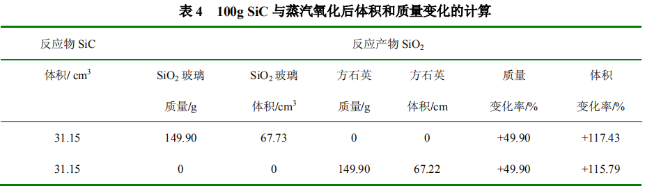 氧化產(chǎn)物為方石英或SiO2玻璃,根據(jù) SiC 和 SiO2的分子量以及SiC、方石英、SiO2 玻璃的密度SiC的 3.21 g·cm-3,方石英的2.23 g·cm -3,SiO2玻璃的2.20 g·cm -3,SiC按上述反應(yīng)產(chǎn)生的質(zhì)量和體積變化的推算結(jié)果見表4。可見,試樣中每單位質(zhì)量SiC與蒸汽發(fā)生氧化反應(yīng)后,質(zhì)量增加49.9%,體積增大約1.2 倍。