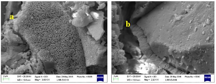圖3是氧化300h試樣的顯微結(jié)構(gòu)照片。圖3a是SiO2玻璃相析晶形成的魚(yú)鱗狀方石英。圖3b是SiC細(xì)粉表面氧化生成的小粒狀方石英。細(xì)粉之間沒(méi)有燒結(jié),界面結(jié)合較弱,呈松散堆積狀態(tài),有利于應(yīng)力的緩沖和釋放。該階段反應(yīng)速率可能處于擴(kuò)散控制階段。前期滲入的水蒸氣發(fā)生還原反應(yīng)。排出氫氣兩種氣體的逆向流動(dòng)逐漸達(dá)到動(dòng)力學(xué)平衡,界面處水蒸氣濃度降低,SiC氧化減弱,主要反應(yīng)為玻璃態(tài)SiO2析晶。