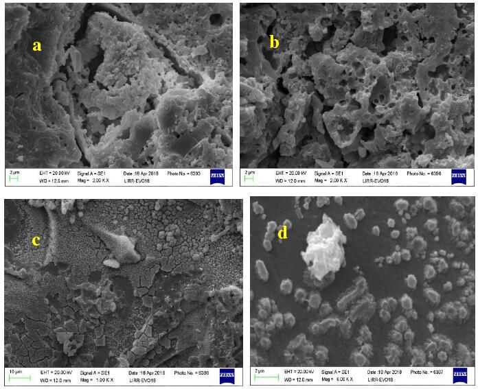 氧化50h該階段的主要反應(yīng)包括水泥的水化失去結(jié)合水合SiC在水蒸氣條件下的氧化。下圖中三角形殼狀物質(zhì)是一顆水泥粒子,其內(nèi)部柱狀產(chǎn)物的分析結(jié)果為:AL2O3約21.45%,SiO2約52.12%,CaO約26.43%。推測(cè)是在水泥位置生成的鈣長(zhǎng)石。下圖b 示出了水泥水化排出結(jié)合水留下的氣孔,和氧化后氣孔率略有增加有關(guān)。圖C示出了水泥水化產(chǎn)物的微裂紋,可以緩解氧化產(chǎn)物SiO2析晶和體積膨脹引發(fā)的結(jié)構(gòu)應(yīng)力。圖d示出了SiC離子表面生成的富SiO2玻璃相,含少量AL2O3,有融合跡象,但不明顯。試樣300h后仍然存在一定量的剛玉相。這是因?yàn)锳L2O3在基質(zhì)中的分布位置和狀態(tài)影響了氧化產(chǎn)物玻璃相的成分,改變了其熔點(diǎn)和粘度,使其鋪展性欠佳,導(dǎo)致氧化產(chǎn)物對(duì)顆粒的保護(hù)作用受限。