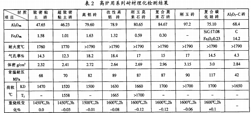 根據(jù)現(xiàn)場實際情況。冶煉礬鈦磁鐵礦的高爐爐底部位。實際溫度在1420℃左右,爐缸的渣液面溫度在1550℃左右或更高一點,通過實驗可以看出,選用粘土磚作爐底用磚仍是可取的,粘土磚只存在侵蝕現(xiàn)象,進一步提高材料的純度和致密程度對提高抗蝕性是非常有利的。超致密粘土磚在1450℃,3h的條件下,最大侵蝕速率僅0.8mm/h,滲 透速率為0而高鋁磚在該溫度條件下同樣為0.8mm/h,而滲透速率為2.0mm/h,因而超致密粘土磚作為爐底材料具有很強的優(yōu)勢。爐缸部位渣液溫度高達1550℃以上,剛玉莫來石磚、復合莫來石磚、復合碳化硅磚都具有較好的抗侵蝕性和滲透性。剛玉莫石磚價格昂貴,抗渣性能并不比復合莫來石磚優(yōu)越;高鋁磚在1550℃靜態(tài)的條件下,侵蝕和滲透現(xiàn)象相當嚴重剛玉磚由于氣孔率高,結(jié)構(gòu)不致密,滲透現(xiàn)象嚴重;AL2O3—C磚抗蝕性良好,但由于存在氧化現(xiàn)象,制品的結(jié)構(gòu)遭到破壞,強度低?乖圆睿o爐效果差,也不可取。