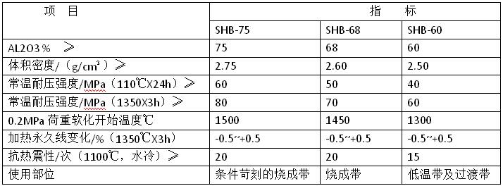 活性石灰回轉窯用不燒磷酸鹽磚按使用部位、使用條件以及理化指標分為SHB-75、SHB-68和SHB-60三個牌號,牌號中S、H、B分別為“石灰”“回轉窯”“不燒”的首個漢字的漢語拼音首字母,阿拉伯數(shù)字為三氧化二鋁的質量百分數(shù)。