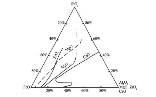 抗鐵硅渣侵蝕較好的材料下圖示出了1500℃時各氧化物成分在FeO-SiO2渣中的溶解度。由圖看出,石灰與硅鐵渣形成的液相區(qū)最大。因此,石灰和CaO含量高的白云石材料抗鐵硅渣熔蝕性差,Cr2O3、ZrO2與鐵硅渣形成的液相區(qū)小,表明其抗鐵硅渣熔蝕性好。