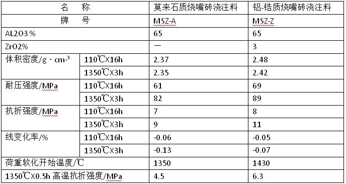 蓄熱式加熱爐用燒嘴磚原材料的選擇較為關(guān)鍵。骨料應(yīng)選擇煅燒充分的二級高鋁熟料、莫來石等原料,一般不應(yīng)選擇熱膨脹系數(shù)較大的剛玉原料。細(xì)粉部分應(yīng)選擇剛玉細(xì)粉、氧化鋁微 粉、二氧化硅微粉、鋯英砂細(xì)粉等,采用Secar71水泥和ρ—AL2O3復(fù)合結(jié)合。表1為燒嘴 磚主要的理化指標(biāo)。