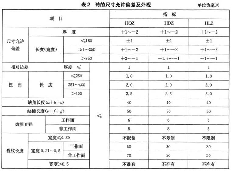 4.2磚的尺寸允許偏差及外觀應(yīng)符合表2的規(guī)定。