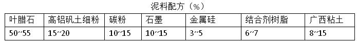 不燒炭質(zhì)塞頭磚的制備工藝泥料配比如下表1,混煉時(shí)間和順序 葉臘石→樹脂→高鋁礬土細(xì)粉→粘土→石墨→碳粉硅粉;炀10min即可使用。結(jié)合劑的選用曾在實(shí)驗(yàn)中選用水玻璃。由于水玻璃不能潤(rùn)濕石墨,而且對(duì)磚基嚴(yán)重地降低耐火度和高溫性能,因此被淘汰。在使用磷酸二氫鋁時(shí),發(fā)現(xiàn)與添加劑金屬Si粉有極大反應(yīng),在燜料過程中泥料早干,因此也被淘汰。只有使用酚醛樹脂,其為熱塑性,加入一定量固化劑,在混煉成型干燥中均為適宜,因此酚醛樹脂作為本材料結(jié)合劑。