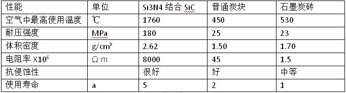 鋁電解用側(cè)部炭塊和石墨化炭磚與氮化硅結(jié)合碳化硅比較其性能見下表