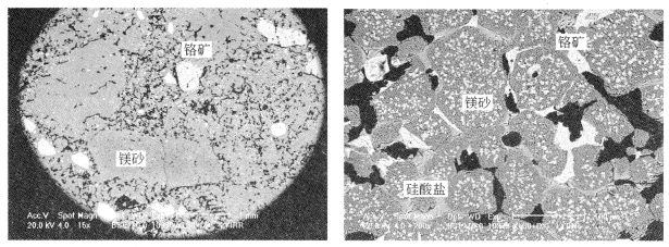 在圖3-la中,灰色顆粒為鎂砂,白色的中顆粒為鉻礦。在圖3-lb中,白色顆粒為鉻礦,灰色渾圓狀顆粒為鎂砂,由于該硅酸鹽結(jié)合鎂鉻磚燒成溫度高,大于1580℃,因此,鎂砂顆粒內(nèi)包含有大量的尖晶石脫溶相。由圖3-1可知:硅酸鹽結(jié)合鎂鉻磚的基質(zhì)中主晶相為粒狀方鎂石,鎂砂和鉻礦顆粒間或各自顆粒間則多以灰白色薄膜狀硅酸鹽(CMS)膠結(jié)相或?yàn)闅饪姿綦x,其次有少量的復(fù)合尖晶石(白色)填充于方鎂石晶間,但直接結(jié)合程度很低;|(zhì)為較致密的網(wǎng)絡(luò)狀結(jié)構(gòu),氣孔多為條狀,少部分呈封閉趨勢。由于硅酸鹽結(jié)合的顯微結(jié)構(gòu)特征不利于普通鎂鉻耐火制品的高溫力學(xué)性能和抗化學(xué)侵蝕性能,因此硅酸鹽結(jié)合鎂鉻磚通常用于對性能要求不苛刻的部位。