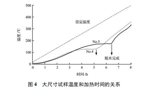 No.5 試樣透氣率有所提高,為了比較,對(duì) No.4試樣進(jìn)行了干燥試驗(yàn)。所獲得的試樣內(nèi)部溫度曲線示于圖 4。對(duì)應(yīng)設(shè)定溫度,No.4 試樣和 No.5 試樣幾乎都是按照相同的速度持續(xù)升溫,但是 No.4 試樣在 130 ℃附近升溫速度放緩,推測(cè)最大蒸汽壓力大約是0.3 MPa。而 No.5 試樣是在180 ℃放緩,推測(cè)蒸汽壓力大約是 1.0 MPa。另外從拐點(diǎn)位置算起,No.4 試樣的脫水完成時(shí)間比 No.5 試樣快 1.3 h 左右。由圖可知,No.4 試樣尺寸大、透氣率高、內(nèi)部蒸汽壓力沒有提高,干燥結(jié)束時(shí)間也早。