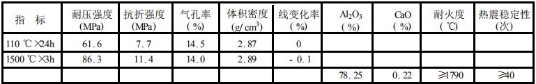 加熱爐、退火爐的正常使用溫度一般12501300 ℃,而燒嘴磚卻要承受14001500 ℃的高溫,燒嘴磚不僅需要足夠的高溫耐火性能及抗熱震性能 ,而且還應具備優(yōu)良的抗高溫氣流沖刷與煙塵侵蝕的能力。因此 ,選用耐火性能優(yōu)良的特級礬土熟料、三石礦物等為主要原料 , ρ-Al2O3 微粉、硅微粉為結(jié)合劑 ,同時選擇適宜的能改善澆注料良好施工性能的外加劑開展工作。按骨料粉料 = 6575∶2535 的比例進行配料試驗 ,首先將配合料在攪拌機內(nèi)干混23分鐘 ,然后加入一定量的加有高效減水劑和外加劑的水溶液 ,濕混56分鐘,出料后在振動臺上成型為 40 ×40 ×160mm的條樣。經(jīng)養(yǎng)護脫模后在烘箱中干燥 ,然后測定其 110 ℃×24h、1000 ℃×3h、1500 ℃×3h的理化性能 ,熱震穩(wěn)定性采用1100 ℃水冷的測定方法,指標如下: