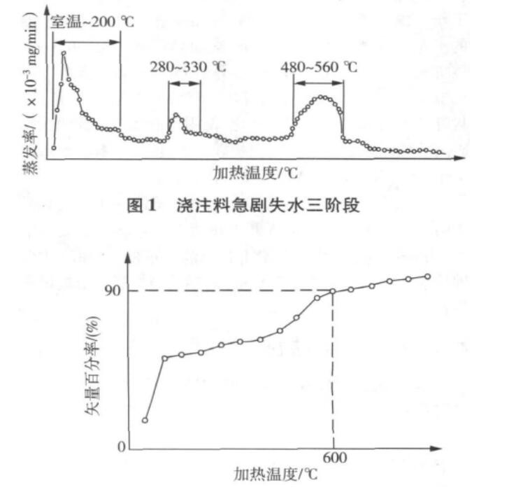 由以上的脫水反應(yīng)方程式看出,水泥中的石水化合物和骨料中的結(jié)合水的脫水溫度與澆注料急劇失水階段。