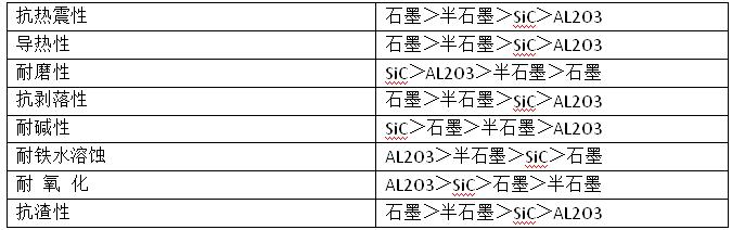 碳化硅爐眼磚的優(yōu)點材質選擇及其性能:按出鐵口的特性要求,對常用的幾種耐火材料進行比較如下: