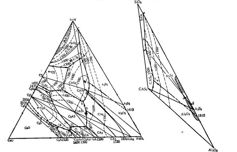 處于A-C-S系統(tǒng)內(nèi),它跨越兩個(gè)分三角形。由此可以看出:配料組成點(diǎn)在A-CAS2-A3S2三角形內(nèi),制品的礦物組成則主要是莫來石和剛玉,在前一三角形內(nèi)開始出現(xiàn)液相的理論溫度是(1345℃);在后三角形內(nèi)開始出現(xiàn)液相的理論溫度是(1512℃)。但是由于有其它雜質(zhì)的存在,實(shí)際出現(xiàn)液相的溫度要低于理論溫度。實(shí)測(cè)發(fā)現(xiàn)高鋁制品一般在1200℃開始出現(xiàn)液相,而且液相粘度低。出現(xiàn)有CAS2、x-石英。從熱變可以看出: