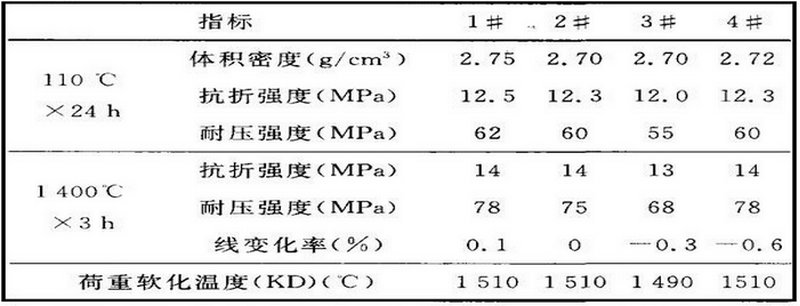 按照比例配好料經(jīng)加水混合均勻后,倒入模具中振動成形為40mmX40mmX160mm試樣各6組,在室溫下養(yǎng)護24h后脫模,測試110℃X24h 處理后體積密度、抗折強度、耐壓強度和1400℃X3h處理后抗折強度、耐壓強度、荷重軟化溫度、燒后線變化率。實驗結(jié)果見表2