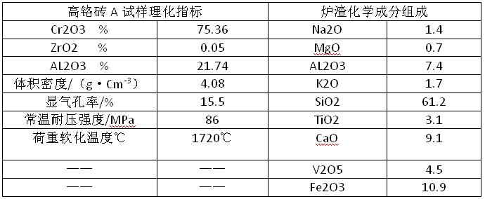圖1(a)為表1中A試樣掛渣反應(yīng)層的SEM照片,掛渣層內(nèi)除了硅酸鹽低熔相外,還有清晰可見(jiàn)的針狀物,針狀物長(zhǎng)約35μm,粗約1μm,能譜分析針狀物主要有Cr2O3和V2O5兩種成分組成,其中Cr2O3約占35%,V2O5約占60%;渣和耐火材料的界面呈鋸齒狀,部分Cr2O3顆粒倍熔蝕;反應(yīng)層部分Cr2O3和氧化鋁被熔蝕,氣孔內(nèi)充填有大量的玻璃相,結(jié)構(gòu)比較疏松。