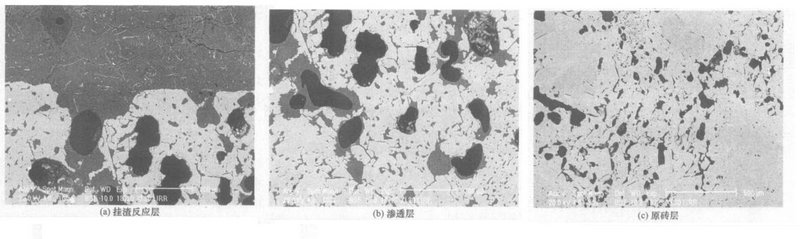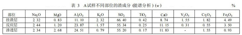 圖 1 ( b)為A試樣滲透層的SEM照片,滲透層內(nèi)存在大量的玻璃相,結(jié)構(gòu)比較疏松,主要由熔渣沿著磚中晶粒間的通道向磚內(nèi)滲透和熔蝕造成。熔渣在滲透過(guò)程中與磚內(nèi)的Cr2O3 和A l2O3接觸而造成其溶解,導(dǎo)致渣內(nèi)Cr2O3和A l2O3含量隨著縱向深度的增加而呈遞增趨勢(shì)(見(jiàn)表3),從而熔蝕了耐火材料,破壞了基質(zhì)同骨料間的結(jié)合,造成其結(jié)構(gòu)疏松;并且距熱面不同的距離會(huì)有不同量和成分的渣在氣孔和晶界通道內(nèi)停留形成不同的段帶,這些不同的段帶因熱膨脹系數(shù)的差異在溫度波動(dòng)時(shí)產(chǎn)生熱應(yīng)力導(dǎo)致磚的剝落而加速了其損壞。