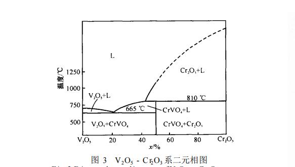 從A試樣掛渣反應(yīng)層的XRD圖譜,可見(jiàn)在反應(yīng)層除了主晶相Cr2O3,還存在少量的混合型尖晶石和釩酸鉻相,混合型尖晶石相(MgFeTi)O(ALCrFe)2O3主要由熔渣內(nèi)的氧化鐵、氧化鎂和Cr2O3在距熱面較近的范圍內(nèi)反應(yīng)生成。能譜分析A試樣反應(yīng)層Cr2O3顆粒的化學(xué)組成為:Cr2O3 84.94% , V2O5 11.77% , A l2O3 3. 29%可見(jiàn),大部分V2O5固溶到Cr2O3 顆粒里,這一點(diǎn)從原渣、掛渣層、反應(yīng)層和滲透層渣內(nèi)V2O5含量隨著滲入深度的增加急劇下降 (表3)也可得以印證。圖3為V2O5-Cr2O3 共存時(shí)的相圖,V2O5的熔點(diǎn)僅670℃,與 Cr2O3共存時(shí),最低共熔溫度665℃,也就是說(shuō),磚在使用過(guò)程中會(huì)不斷與石油焦分解產(chǎn)生的 V2O5接觸產(chǎn)生固溶,可在非常低的溫度下形成液相,從而導(dǎo)致Cr2O3 顆粒的熔蝕,形成鋸齒狀的界面和反應(yīng)層的失強(qiáng);熔蝕到渣內(nèi)的Cr2O3在冷卻時(shí)又會(huì)同V2O5共同析晶生成釩酸鉻 (CrVO4 ),即圖1 ( a)中所見(jiàn)的針狀物 (能譜分析針狀物的組成與釩酸鉻的理論組成相似 )。值得注意的是 , Al2O3與V2O5共存時(shí)的最低共熔溫度僅640℃,與V2O5接觸時(shí)也會(huì)導(dǎo)致它的熔蝕。