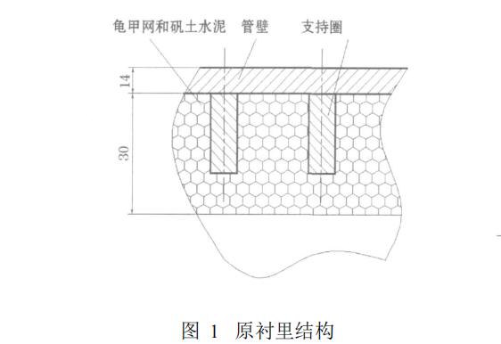 電爐自投產(chǎn)以來,產(chǎn)量不斷上升,5條大直徑風送管道采用的材料為碳鋼,襯里結(jié)構(gòu)為支撐圈焊接龜甲網(wǎng),并在龜甲網(wǎng)上涂抹耐高溫的礬土水泥,原襯里結(jié)構(gòu)如圖1所示。