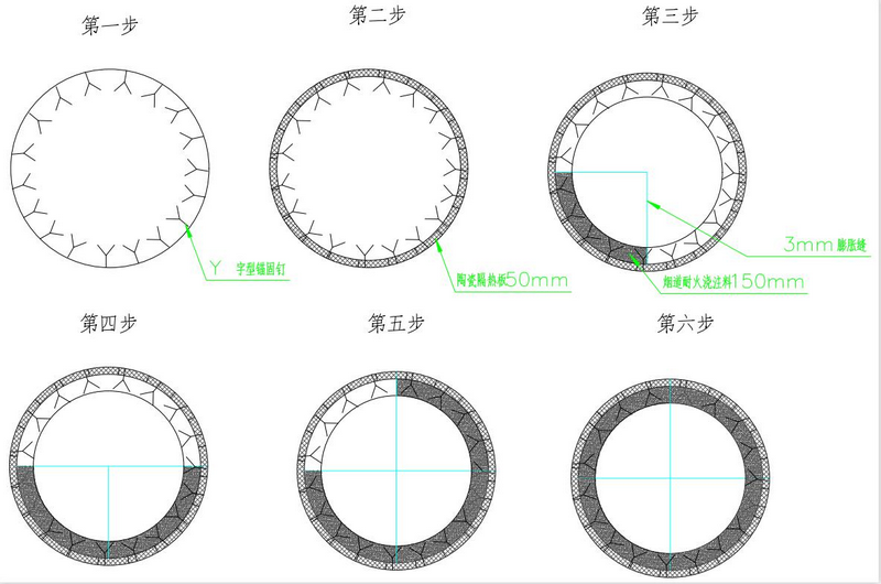 煙氣管道內(nèi)襯耐火澆注料的安裝是一個重要工作,現(xiàn)對管道內(nèi)襯耐火澆注料的施工形式的特點(diǎn)、范圍以及接口處的施工方法進(jìn)行描述(如上圖)。我公司此次對管道保溫內(nèi)襯使用材料整體分為三部分,①耐火澆注料②陶瓷隔熱板③錨固件。