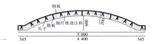 鋼纖維澆注料拱頂設(shè)計(jì)如上圖所示。首先用10mm厚鋼板制作模板,里面加筋板和錨固爪,筋板的作用是提高整個(gè)模板的剛度,防止變形,錨固爪的作用是通過增大和鋼纖維澆注料的 接觸面積從而增大吸附力。然后用鋼纖維澆注料一次性澆筑成型,尺寸5090mmX2200mm、拱高600 mm、厚度200mm,在原來基礎(chǔ)上兩邊各加345mm用于擱放在墻體上按要求養(yǎng)護(hù)7d后便可吊裝使用。本次試驗(yàn)采用的是鋼纖維含量1.4%的澆注料,成分包括鋁礬土、棕剛玉顆粒、氧化鋁超微粉、碳化硅粉、硅微粉、CA-70水泥、耐熱鋼纖維、防爆鋼纖維、聚磷酸鈉、六偏磷酸鈉。