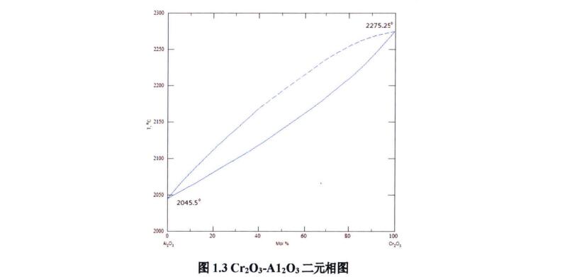 Cr203和AL203的晶體結構相同,離子半徑相差13.7%,因此,高溫下Cr203和AL203可以形成無限固溶體,如圖1.3所示。從液一固相線看,隨著Cr203含量的增加,開始出現(xiàn)液相的溫度也隨之升高,因此在A1203中添加適量的Cr203能顯著改善剛玉系耐火材料力學性能和高溫使用性能。