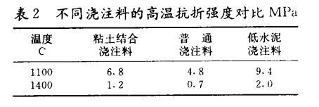 圖2為低水泥澆注料與普通澆注料、粘土澆注料強(qiáng)度變化的比較?梢,低水泥澆注料常溫強(qiáng)度較高,而中溫強(qiáng)度也不降低。表2表明了不同澆注料高溫?zé)釕B(tài)抗折強(qiáng)度的對比,可見低水泥澆注料的高溫抗折強(qiáng)度為普通澆注料的2~3倍,比粘土的也提高了許多。著說明低水泥澆注料兼有普通澆注料和粘土澆注料兩者的優(yōu)點(diǎn),它在各種溫度下都有高強(qiáng)度的特點(diǎn),這對于溫度高,出鋼頻繁,鋼錠和鉗吊經(jīng)常碰撞的場合,無疑是有好處的。