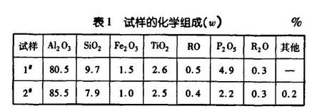 以往選用熔鋁爐內(nèi)襯高鋁磚時(shí)多關(guān)注制品的常規(guī)指標(biāo),對(duì)制品的侵蝕性沒有足夠重視。結(jié)果在實(shí)際使用時(shí),指標(biāo)優(yōu)秀的制品出現(xiàn)被侵蝕嚴(yán)重的現(xiàn)象,選用了國外熔鋁爐內(nèi)襯高鋁磚和國內(nèi)高鋁磚做了對(duì)比,編號(hào)分別為1#,2#。它們的化學(xué)組成見表1。2#試樣的AL2O3含量大于1#試樣的AL2O3含量,SiO2含量小于1#試樣的SiO2含量。