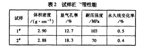 對(duì)1#、2#試樣做物理性能檢測(cè),見表2。試樣的體積密度和永久線變化相近,但AL2O3含量高的2#試樣的顯氣孔率大于1#試樣的顯氣孔率,耐壓強(qiáng)度也明顯低于1#試樣。