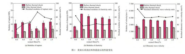 在熱震過程中,隨著鋼纖維的增加,澆注料內(nèi)部缺陷的數(shù)量會(huì)增多,也將導(dǎo)致材料彈性模量保持率的降低(見圖2b);缺陷數(shù)量增多提高了彼此間橋接互聯(lián)的概率,增加了澆注料基體結(jié)構(gòu)的不連貫性,引起材料超聲波波速保持率的下降(見圖 2c)。