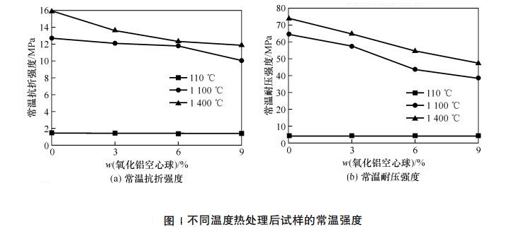 1示出了不同溫度熱處理后試樣的常溫強(qiáng)度。從圖中可以看出,試樣的常溫強(qiáng)度隨氧化鋁空心球加入量的增加而降低。同時(shí),隨著熱處理溫度升高,試樣的常溫強(qiáng)度逐漸增大。當(dāng)氧化鋁空心球加入量為9%時(shí),1400熱處理后試樣的常溫抗折強(qiáng)度和常溫耐壓強(qiáng)度分別為11.947.1MPa.110 烘干后試樣的強(qiáng)度主要由莫來(lái)石骨料的本征強(qiáng)度提供。但基質(zhì)與細(xì)粉的結(jié)合強(qiáng)度并不高,故此時(shí)常溫耐壓強(qiáng)度較低。經(jīng)1400高溫處理后,骨料和微粉間燒結(jié)作用使得澆注料中的顆粒之間結(jié)合更加緊密,且氧化鋁微粉和二氧化硅微粉反應(yīng)生成莫來(lái)石,提高澆注料強(qiáng)度然而,由于氧化鋁空心球取代了部分骨料,增加試樣的氣孔率,導(dǎo)致力學(xué)強(qiáng)度下降。 但氧化鋁空心球提高了莫來(lái)石的生成量,且氧化鋁空心球的多孔結(jié)構(gòu)能夠阻礙裂紋擴(kuò)展,故其強(qiáng)度下降較少。