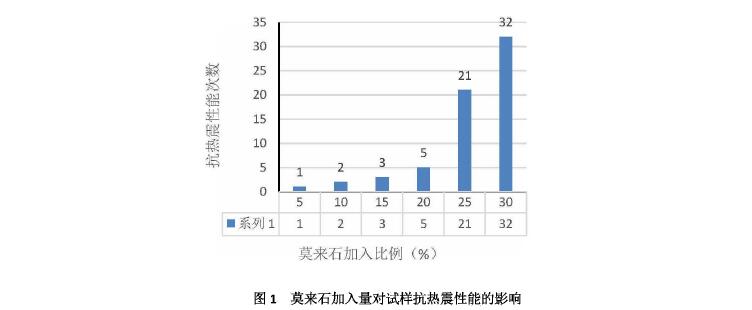 (2)莫來石的加入量在20%以下時,制品的抗熱震性能提升緩慢,對實際應用意義不大。莫來石加入量過多,抗熱震性能雖然會進一步提高,但其它物理性能則會下降,綜合考慮,莫來石加入量為25%~30%,制品的體積密度,顯氣孔率,耐壓強度適中,抗熱震性良好,各項指標均能滿足使用。