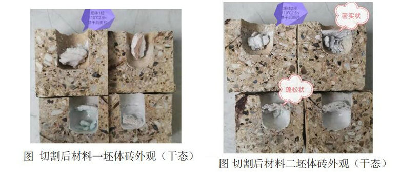 模擬項目廢硫酸原料工況,將工業(yè)級硫酸鈉、硫酸鉀和氯化鉀混合均勻配制成混合鹽,分別加入4個坯體磚坩堝內(nèi),并在混合鹽上表面覆蓋石英粉,防止熔鹽在高溫時沸濺,最后在坯體磚上蓋好耐火材料的蓋子。同時將 4 個坯體磚放入同一加熱爐內(nèi)升溫,升溫到 1 150 ℃后恒溫 1.5 h,停爐降溫。待坯體磚溫度降至常溫后,將其沿坩堝垂直方向進行帶水切割,觀察其斷面情況。切割前后坯體磚外觀。