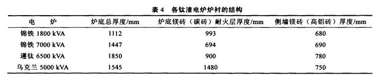 由于鈦渣電爐生產(chǎn)是在高溫下完成的,同時鈦渣熔體具有非常強的腐蝕性,一方面它能與冶金中普遍使用的耐火材料發(fā)生作用,另一方面在高溫條件下爐渣和金屬熔體對爐襯還存在沖刷作用,因此冶煉過程所處的環(huán)境是極其復(fù)雜和惡劣的。所以合適的爐襯結(jié)構(gòu)和足夠的工作層厚度是延長爐襯壽命,實現(xiàn)鈦渣電爐正常生產(chǎn)的前提和保證。